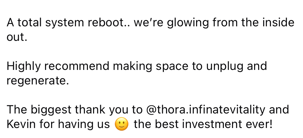 “Spending a week with Thora and Kevin was powerful. Experiencing their health modalities and technology firsthand made a lasting impact on me and my family’s vitality.”